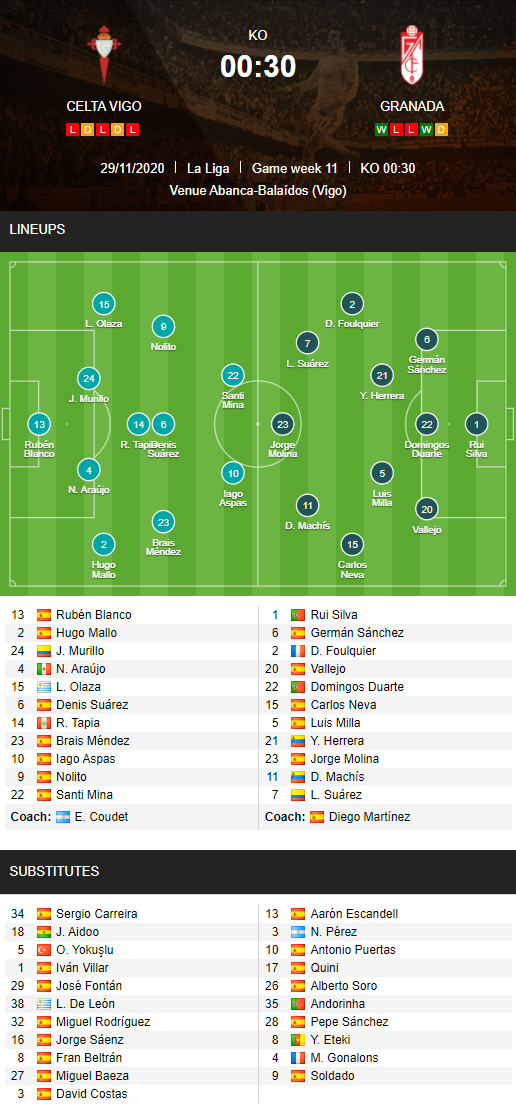 AEGoal chốt kèo bóng đá trực tiếp trận Celta Vigo vs Granada diễn ra lúc 00h30 ngày 30/11 trong khuôn khổ giải VĐQG Tây Ban Nha sau khi dựa trên tính toán, chuyển động về kèo châu Á và đội hình ra sân của 2 đội.