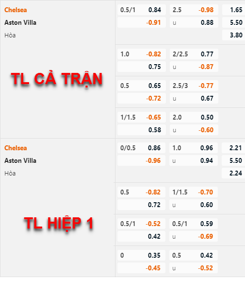 AEGoal chốt kèo bóng đá trực tiếp trận Chelsea vs Aston Villa diễn ra lúc 23h30 ngày 01/04 trong khuôn khổ giải Ngoại hạng Anh sau khi dựa trên tính toán, chuyển động về kèo châu Á và đội hình ra sân của 2 đội.
