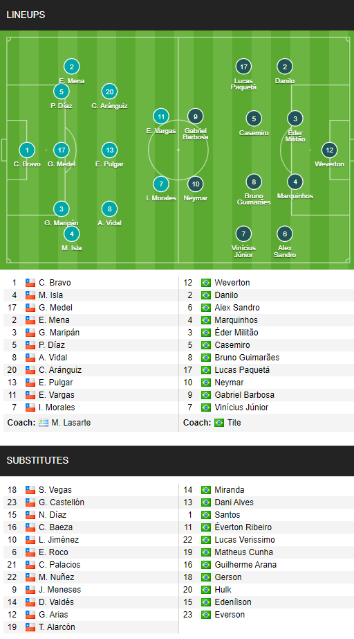 - Brazil (4-2-3-1): Weverton - Dani Alves, Marquinhos, Militao, Sandro - Casemiro, Guimaraes - Riberio, Paqueta, Neymar – Barbosa