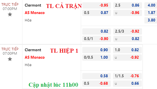 Chốt kèo trực tiếp trận Clermont vs Monaco (19h00):