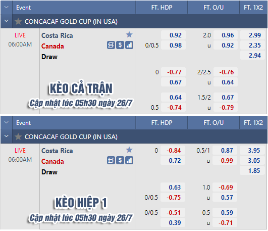 * Chốt kèo trận Costa Rica vs Canada (06h00 ngày 26/7)