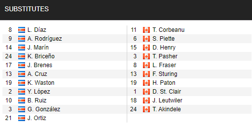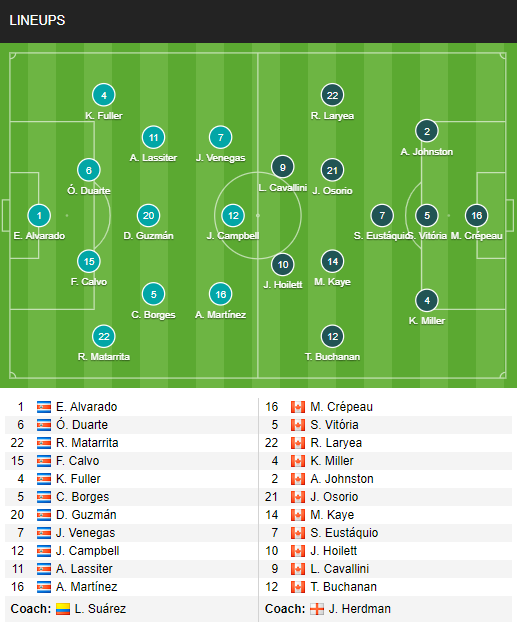 Trong đội hình ra sân của Costa Rica ở trận này, ngoài thiếu vắng của Moreira vì thẻ phạt thì cũng có 1 số thay đổi trong đội hình khi những cái tên vừa thi đấu ở lượt cuối vòng bảng chỉ có tên trên băng ghế dự bị. Trong khi Canada cũng có 1 vài thay đổi, nhưng không đáng kể.