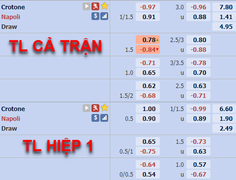 Tỷ lệ chấp của Napoli trên sàn giao dịch châu Á hiện tại đã được kèo từ mốc 1 1/2 ở lần cập nhật trước đấy của chúng tôi xuống mốc 1 1/4 hiện tại. Ở bên phía tỷ lệ tài xỉu mốc 3 hoà vẫn được duy trì như trước đây nhưng điểm ăn của cửa tài đã được đẩy lên cao.
