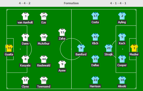Không có bất ngờ nào trong cách bố trí đội hình của đôi bên, khi những cái tên chủ chốt như Zaha, Townsend (Crystal Palace) hay Bamford, Harrison, Klich (Leeds) vẫn xuất hiện ngay từ đầu. Nhìn chung là với ưu thế sân nhà mà Crystal Palace lại chỉ có tỷ lệ như vậy là không khả quan.