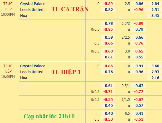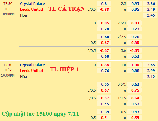 AEGoal chốt kèo bóng đá trực tiếp trận Crystal Palace vs Leeds Utd diễn ra lúc 22h00 ngày 07/11 trong khuôn khổ giải Ngoại hạng Anh sau khi dựa trên tính toán, chuyển động về kèo châu Á và đội hình ra sân của 2 đội.