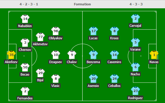 + Real Madrid: Navas; Carvajal, Varene, Nacho, Hernandez, Casemiro, Kross, Modric, Asensio, Benzema, Diaz