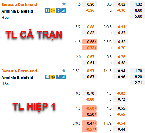Tỷ lệ của Dortmund có xu hướng giảm thời gian vừa qua, hiện tại tỷ lệ chấp chính của đội chủ nhà đã bị kéo xuống mức 1 1/2 thay cho mức 1 3/4 ở thời điểm chúng tôi cập nhật sáng nay. Tương tự bên phía tỷ lệ tài xỉu mốc 3 hoà cũng đang dần được đẩy lên thay thế cho mốc 3 1/4 làm mức tài xỉu chính của trận đấu.