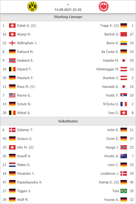 Ngoài những trường hợp vắng mặt của Marcel Schmelzer, Mats Hummels, Marius Wolf, Mateu Morey hay Dan-Axel Zagadou thì Delany cũng không xuất phát nagay từ đầu ở trận này. Trong khi Eintracht Frankfurt vẫn đảm bảo được lực lượng gần như tốt nhất ở trận này.