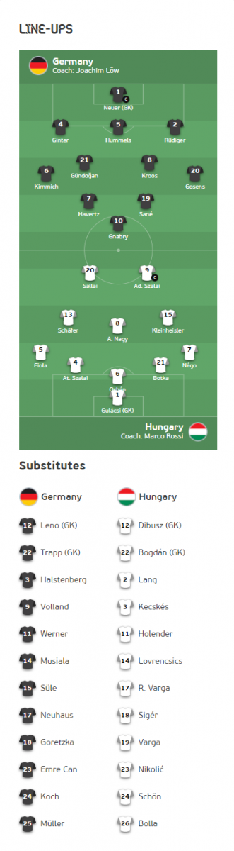 - Hungary (4-4-2): Gulacsi - Botka, Orban, At. Szalai - Nagy - Nego, Kleinheisler, Schafer, Fiola - Nikolic, Sallai