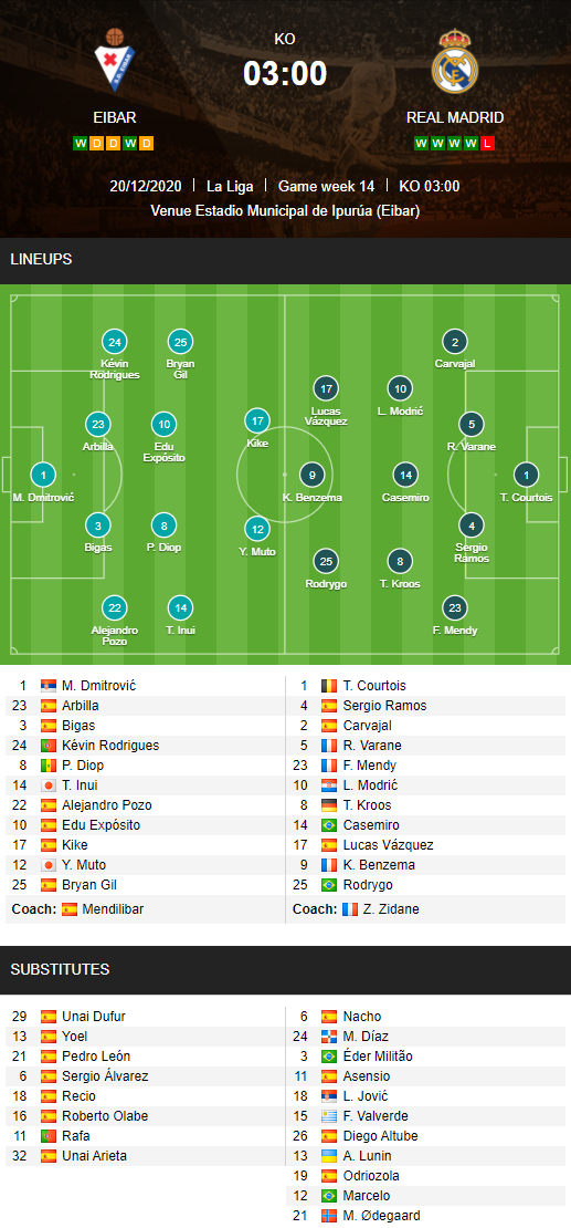 AEGoal chốt kèo bóng đá trực tiếp trận Eibar vs Real Madrid diễn ra lúc 03h00 ngày 21/12 trong khuôn khổ giải VĐQG Tây Ban Nha sau khi dựa trên tính toán, chuyển động về kèo châu Á và đội hình ra sân của 2 đội.