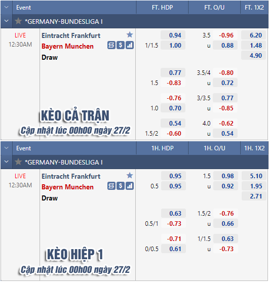 * Chốt kèo trận Eintracht Frankfurt vs Bayern Munich (0h30 ngày 27/2)