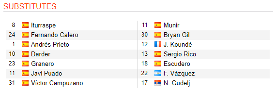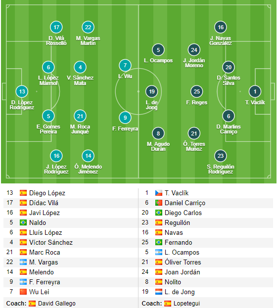 Trong đội hình ra sân của 2 đội ở trận này, Espanyol dù được chơi trên sân nhà nhưng tỏ ra khá thận trọng với sơ đồ 4-4-2 với Wu Lei và Ferreyra trên hàng công, trong khi Sevilla ra sân với đội hình 4-3-3 với Luke de Jong, Nolito và Joan Jordan, với những cái tên này thật khó để trông chờ vào khả năng cởi mở của trận đấu.