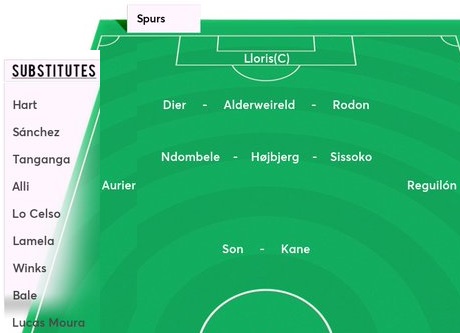 Tottenham: Lloris(C); Dier, Alderweireld, Rodon; Aurier, Ndombele, Højbjerg, Sissoko, Reguilón; Son, Kane.
