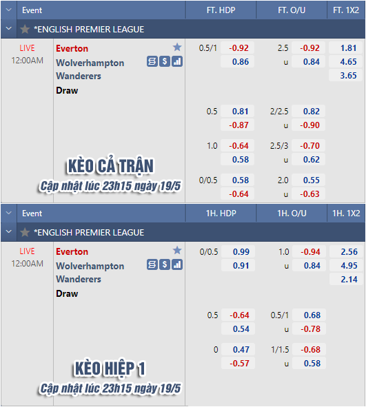 AEGoal chốt kèo bóng đá trực tiếp trận Everton vs Wolves diễn ra lúc 00h00 ngày 20/5 trong khuôn khổ giải Ngoại hạng Anh sau khi dựa trên tính toán, chuyển động về kèo châu Á và đội hình ra sân của 2 đội.