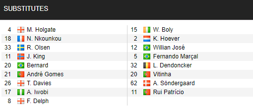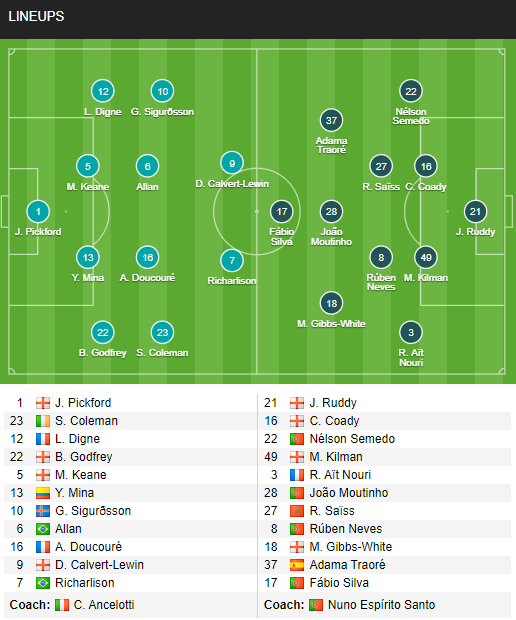 Everton: Pickford; Coleman, Godfrey, Keane, Digne; Doucoure, Allan; Rodriguez, Sigurdsson, Richarlison; Calvert-Lewin