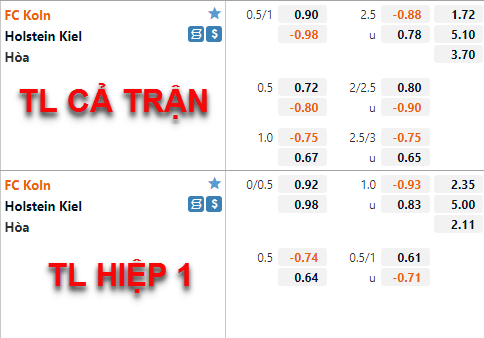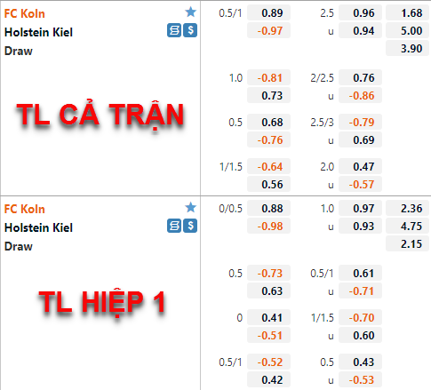 Tỷ lệ chấp của FC Koln vẫn đang được duy trì ở mức 3/4 như thời điểm chúng tôi cập nhật trước đây, điểm ăn của 2 cửa cũng gần như không có biến động nào đáng kể. Trong khi đó tỷ lệ tài xỉu của trận đấu lại có nhưng biến động rõ rệt, mốc 2 1/2 vẫn là mốc chính của trận đấu nhưng điểm ăn của cửa tài đã được điều chỉnh giảm tương đối nhiều.
