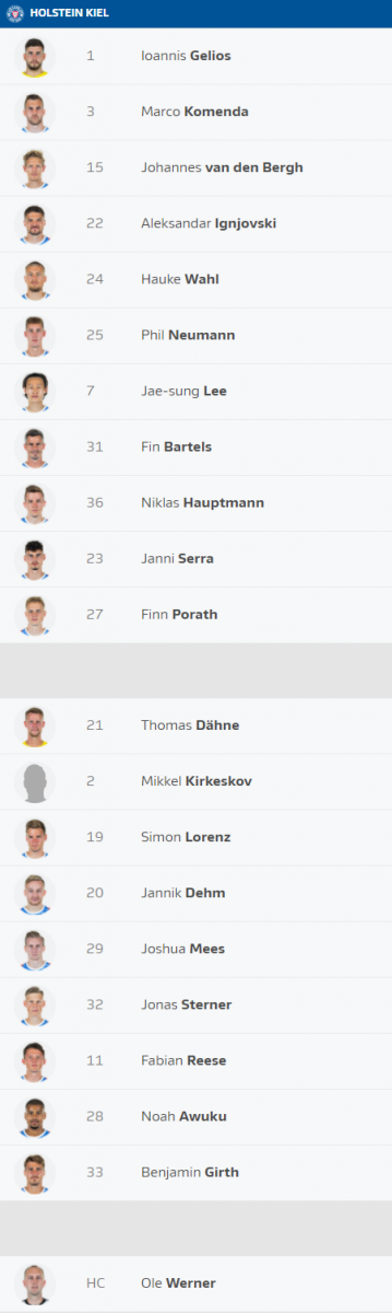 Holstein Kiel: Vắng Arslan do chấn thương. Khả năng ra sân của Gelios và Thesker còn bỏ ngỏ.
