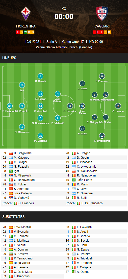 - Trận đấu: Fiorentina vs Cagliari (Vòng 17 - VĐQG Italia)