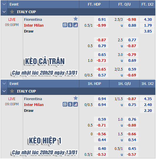 AEGoal chốt kèo bóng đá trực tiếp trận Fiorentina vs Inter Milan diễn ra lúc 21h00 ngày 13/01 trong khuôn khổ giải cúp QG Italia sau khi dựa trên tính toán, chuyển động về kèo châu Á và đội hình ra sân của 2 đội.