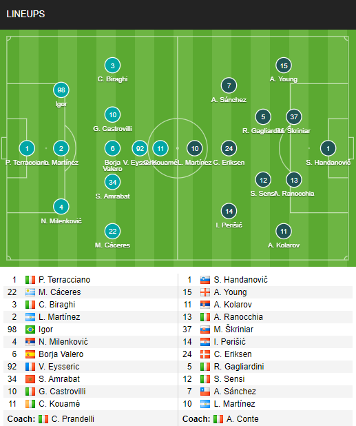 Inter Milan (3-5-2): Radu; Kolarov, Ranocchia, Skriniar; Young, Sensi, Brozovic, Gagliardini, Perisic; Martinez, Sanchez.