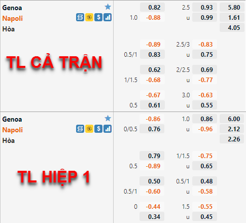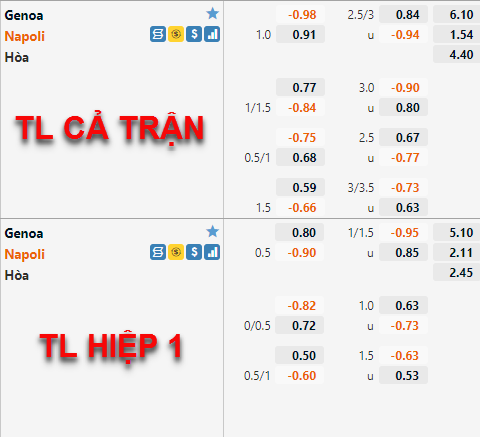 Tỷ lệ chấp của Napoli đã có xu hướng giảm điểm thời gian vừa qua. Mức chấp chính 1 hoà của Napoli ở thời điểm chúng tôi cập nhật sáng này đã được nhà cái kéo xuống tới mức chấp 3/4. Bên phía tỷ lệ tài xỉu của trận đấu cũng có diễn biến tương tự khi mốc 2 1/2 đã thay thể mốc 2 3/4 trước đây làm mốc chính của trận đấu.