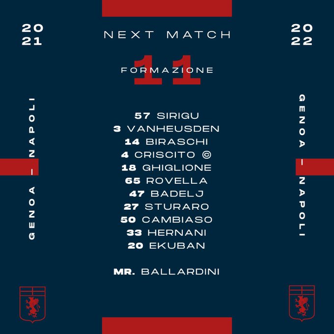 Genoa: Không có sự phục vụ của Mattia Bani, Valon Behrami vì án treo giò. Cassata chưa trở lại từ đầu mùa.