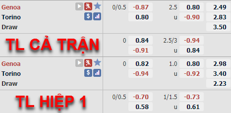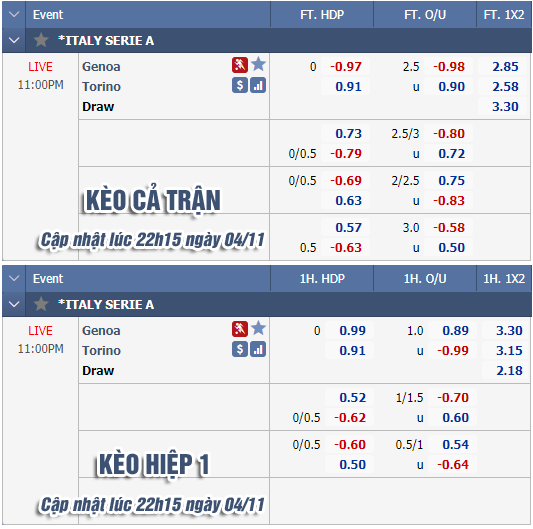 * Chốt kèo trận Genoa vs Torino (23h00 ngày 04/11)