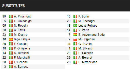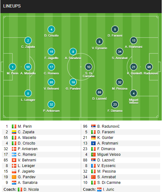 Trong đội hình ra sân ở trận này, ở vào hoàn cảnh buộc phải thắng để chắc chắn trụ hạng, không bất ngờ khi những cái tên tốt nhất của Genoa đều được sử dụng, trong khi đó với Verona, đã có 1 số thay đổi trong đội hình, và với cách điều chỉnh như vậy, có vẻ như động lực thi đấu của đội khách là không quá lớn, vì vậy có thể hy vọng vào 1 kết quả có lợi cho Genoa ở trận đấu tới.
