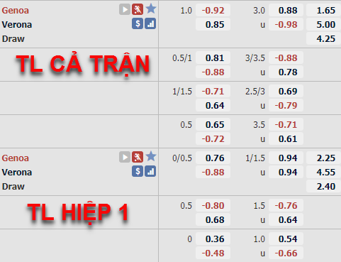 Trong những diễn biến mới nhất trên sàn giao dịch châu Á, Genoa vẫn đang duy trì được kèo chấp 1 hoà trước Verona, bên cạnh đó thì điểm ăn cũng không có sự dịch chuyển quá lớn khi vẫn đang duy trì ở mức bỏ cho Genoa. Trong khi đó, mốc tổng bàn thắng cũng tiếp tục duy trì ổn định ở mức 3 hoà cùng điểm ăn thấp cho cửa Tài, điều này đang đem đến hy vọng cho khả năng bùng nổ của trận đấu.