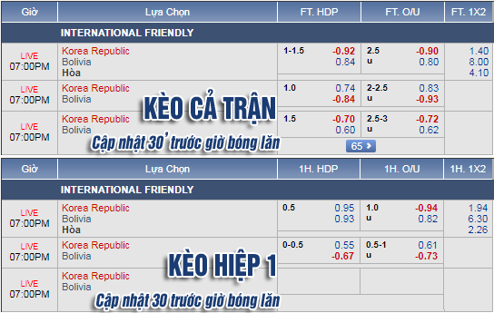 * Chốt kèo trận Hàn Quốc vs Bolivia (18h00)