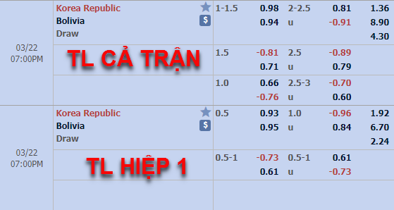 Trong những diễn biến mới nhất trên sàn giao dịch châu Á, Hàn Quốc vẫn đang duy trì được tỷ lệ chấp -1 1/4 với Bolivia, tuy nhiên thang điểm ăn đã có những dịch chuyến cho thấy bất lợi với đội chủ nhà khi điểm ăn mã này đã tăng đáng kể, ở chiều ngược lại cũng chứng kiến đà giảm tương đương ở điểm ăn của Bolivia. Trong khi đó, mốc tỷ lệ tổng bàn thắng cả trận đã tăng từ 2 1/4 lên 2 1/2 và đang gợi mở cho 1 kịch bản tưng bừng.
