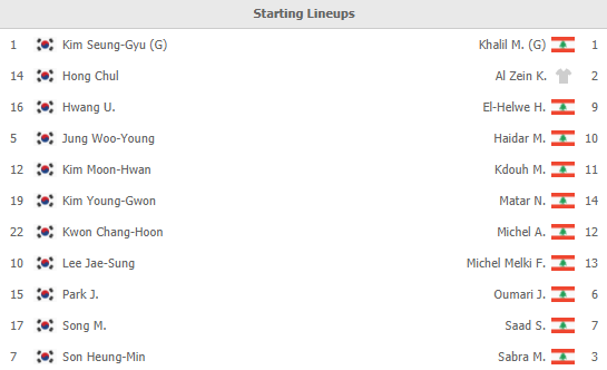 Trận cầu này trên thực tế chỉ còn mang ý nghĩa thủ tục, do Hàn Quốc hơn Lebanon 3 điểm và hiệu số vượt trội hoàn toàn (+20 so với +4). Tuy nhiên thì HLV Bento vẫn sử dụng đội hình tương đối mạnh khi cả Son Heung-Min hay Hwang Ui-Jo đều đá chính.