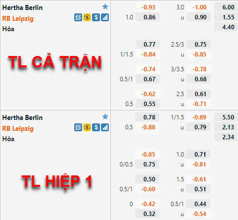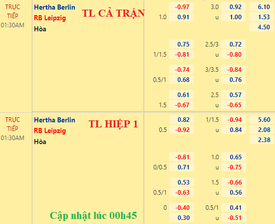 Đội khách vẫn chấp 1 hòa, điểm ăn tăng không đáng kể, trong khi tài xỉu vẫn là 3 hòa. Chơi không đúng với kỳ vọng từ đầu mùa nhưng tỷ lệ chấp như vậy trên sân khách cho thấy cửa RB Leipzig sáng giá, nhất là khi Hertha Berlin đang sa sút trầm trọng.