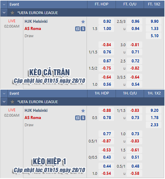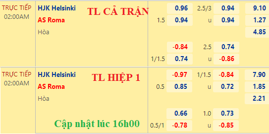 * Chốt kèo trận HJK Helsinki vs AS Roma (02h00 ngày 28/10)