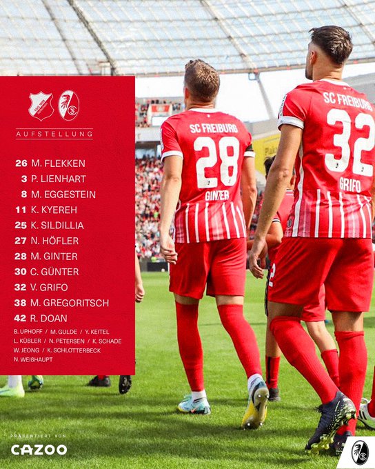 Freiburg: Flekken; Sildillia, Ginter, Lienhart, Gunter; Eggestein, Hofler; Doan, Jeong, Grifo; Gregoritsch