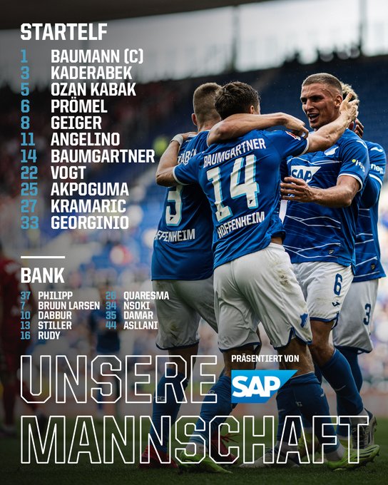 Hoffenheim: Baumann; Kabak, Vogt, Akpoguma; Skov, Promel, Geiger, Angelino; Baumgartner; Kramaric, Rutter