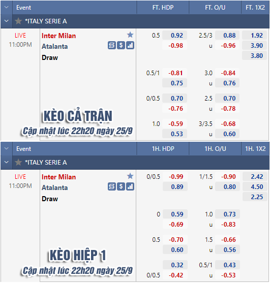 AEGoal chốt kèo bóng đá trực tiếp trận Inter Milan vs Atalanta diễn ra lúc 23h00 ngày 25/09 trong khuôn khổ giải VĐQG Italia sau khi dựa trên tính toán, chuyển động về kèo châu Á và đội hình ra sân của 2 đội.