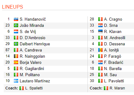 HLV Spalletti quyết định để hàng loạt trụ cột như Icardi, Perisic, Brozovic, Skriniar... trên bằng ghế dự bị; điều đó khiến cho niềm tin mà giới mộ điệu dành cho Inter suy giảm rõ rệt. So với 16h chiều ngày 29/9, tỷ lệ chấp 1 1/2 của Inter Milan chỉ còn 1 1/4 trong khi mốc tài xỉu cũng giảm từ 3 hòa xuống còn 2 3/4.