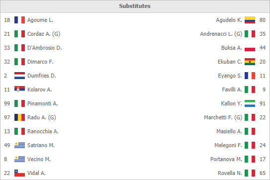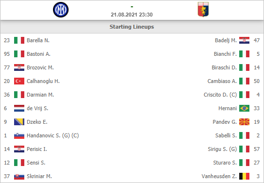 - Inter Milan: Handanovic; Skriniar, De Vrij, Bastoni; Darmian, Barella, Brozovic, Calhanoglu, Perisic; Sensi; Dzeko.