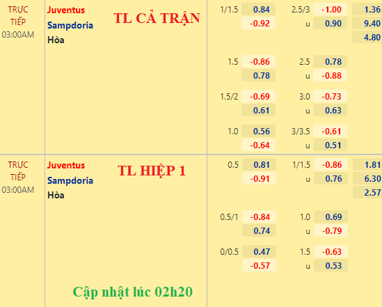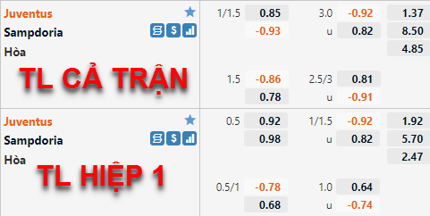 Trên sàn châu Á, Juventus vẫn duy trì kèo chấp 1 1/4 cùng điểm ăn thấp. Việc lão bà duy trì tỷ lệ chấp như vậy trong bối cảnh tài xỉu có xu hướng giảm cho thấy cửa trên sáng giá, nhất là khi Sampdoria không tung vào sân những nhân tố tốt nhất.