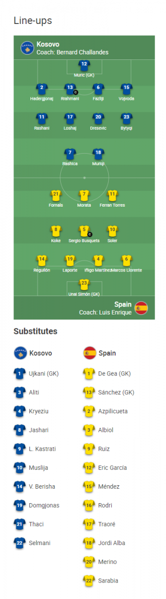 Kosovo (4-2-3-1): Samir Ujkani; Amir Rrahmani, Mergim Vojvoda, Ibrahim Dresevic, Fidan Aliti; Hekuran Kryeziu, Valon Berisha; Florent Muslija, Elbasan Rashani, Milot Rashica; Vedat Muriqi
