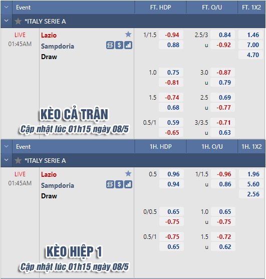 * Chốt kèo trận Lazio vs Sampdoria (01h45 ngày 08/05)