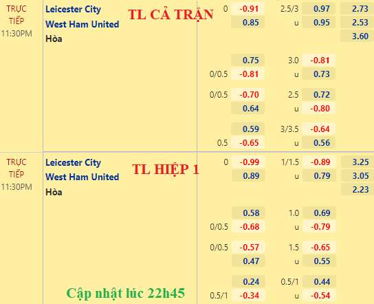 AEGoal chốt kèo bóng đá trực tiếp trận Leicester City vs West Ham diễn ra lúc 23h30 ngày 13/02 trong khuôn khổ giải Ngoại hạng Anh sau khi dựa trên tính toán, chuyển động về kèo châu Á và đội hình ra sân của 2 đội.