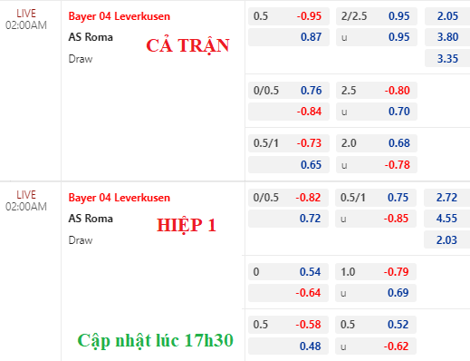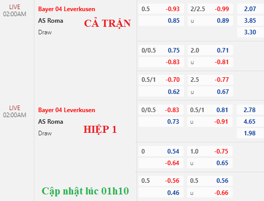 Leverkusen vẫn chấp hòa nhưng điểm bỏ sâu, trong khi tài xỉu 2 1/4 ghi nhận lợi nhuận cho cửa tài tiến đến mức bỏ. Trong thế buộc phải thắng, việc Leverkusen thiếu đi sức bật về tỷ lệ là điều đáng lo ngại.
