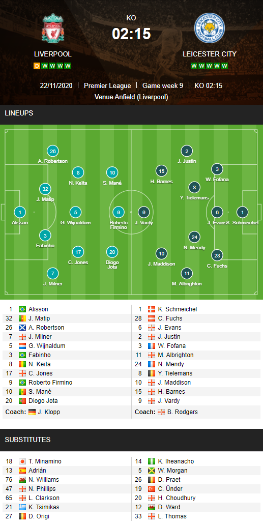 AEGoal chốt kèo bóng đá trực tiếp trận Liverpool vs Leicester City diễn ra lúc 02h15 ngày 23/11 trong khuôn khổ giải Ngoại hạng Anh sau khi dựa trên tính toán, chuyển động về kèo châu Á và đội hình ra sân của 2 đội.