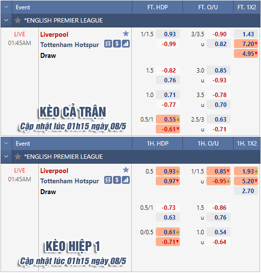 AEGoal chốt kèo bóng đá trực tiếp trận Liverpool vs Tottenham diễn ra lúc 01h45 ngày 08/05 trong khuôn khổ giải Ngoại hạng Anh sau khi dựa trên tính toán, chuyển động về kèo châu Á và đội hình ra sân của 2 đội.