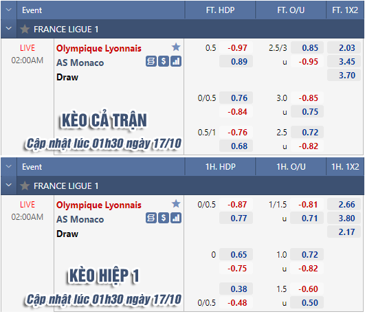 * Chốt kèo trận Lyon vs Monaco (02h00 ngày 17/10)