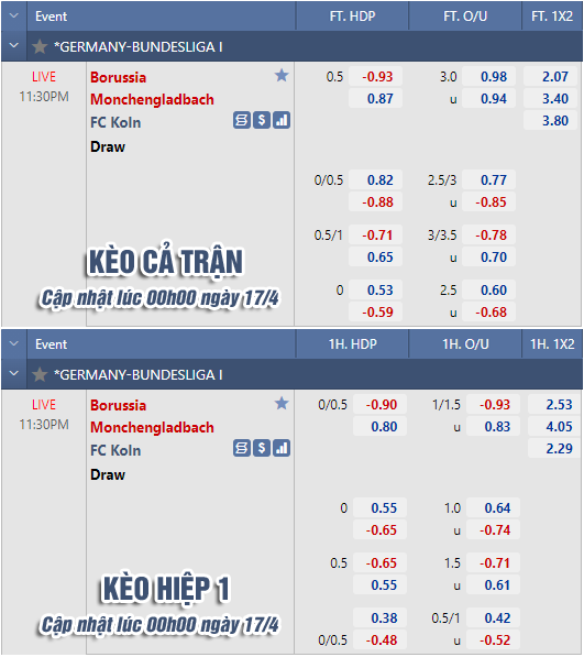 * Chốt kèo trận M'gladbach vs FC Koln (23h30 ngày 16/4)