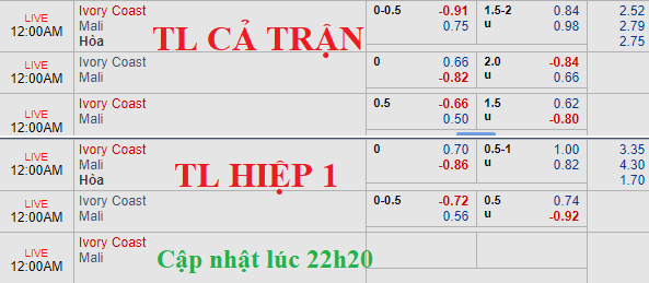 So với cuối phiên khớp lệnh chiều nay (08/07), Bờ Biển Ngà vẫn giữ được kèo chấp đồng banh, nhưng điểm ăn cho cửa trên của họ đã bỏ rất sâu (-0.91). Trong khi handicap có dịch chuyển không hề nhỏ về giá thì mốc tài xỉu lại đứng im không biến động, kể cả về lợi nhuận cho 2 cửa.