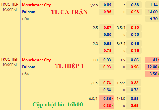 Trên sàn châu Á, Man City tụt giá khi chỉ còn chấp 2 hòa, còn tài xỉu 3 1/2 cũng ghi nhận lợi nhuận ở cửa tài tăng đôi chút. Tuy kèo giảm nhưng rõ ràng Man xanh vẫn là lựa chọn đáng tin cậy với nhiều ngôi sao trong đội hình và phía đối diện thì Fulham cũng vắng chân sút chủ lực Mitrovic.